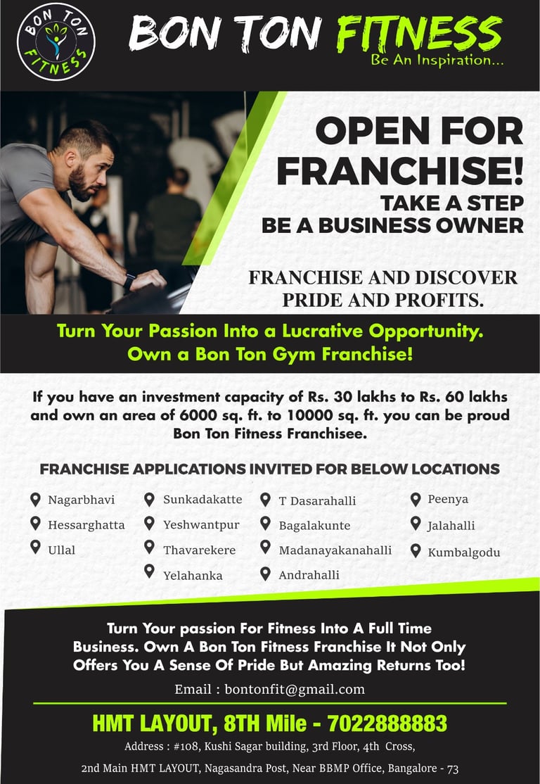 If you have an investment capacity of Rs. 50 lakhs to Rs. 1 crore and own an area of 6000 sq. ft. to 12000 sq. ft. you can be proud Bon Ton Fitness Franchisee.